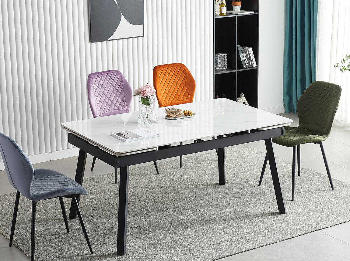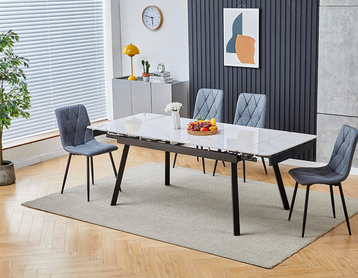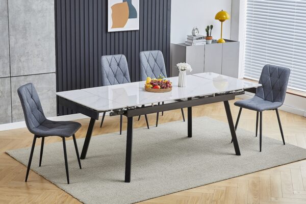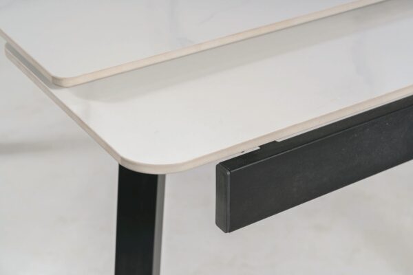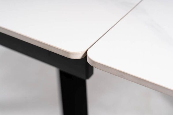 Ploča od sinteriranog kamena odlikuje se luksuznim izgledom, visokom otpornošću na ogrebotine, toplotu i mrlje, što ga čini savršenim za svakodnevnu upotrebu. Crni metalni nogari dodaju stabilnost i moderan industrijski stil, stvarajući elegantan kontrast sa sofisticiranom teksturom kamene ploče.