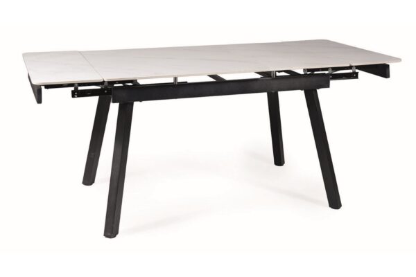 Trpezarijski stol koji kombinuje vrhunsku estetiku i izdržljivost zahvaljujući ploči od sinteriranog kamena i čvrstim crnim metalnim nogarima.