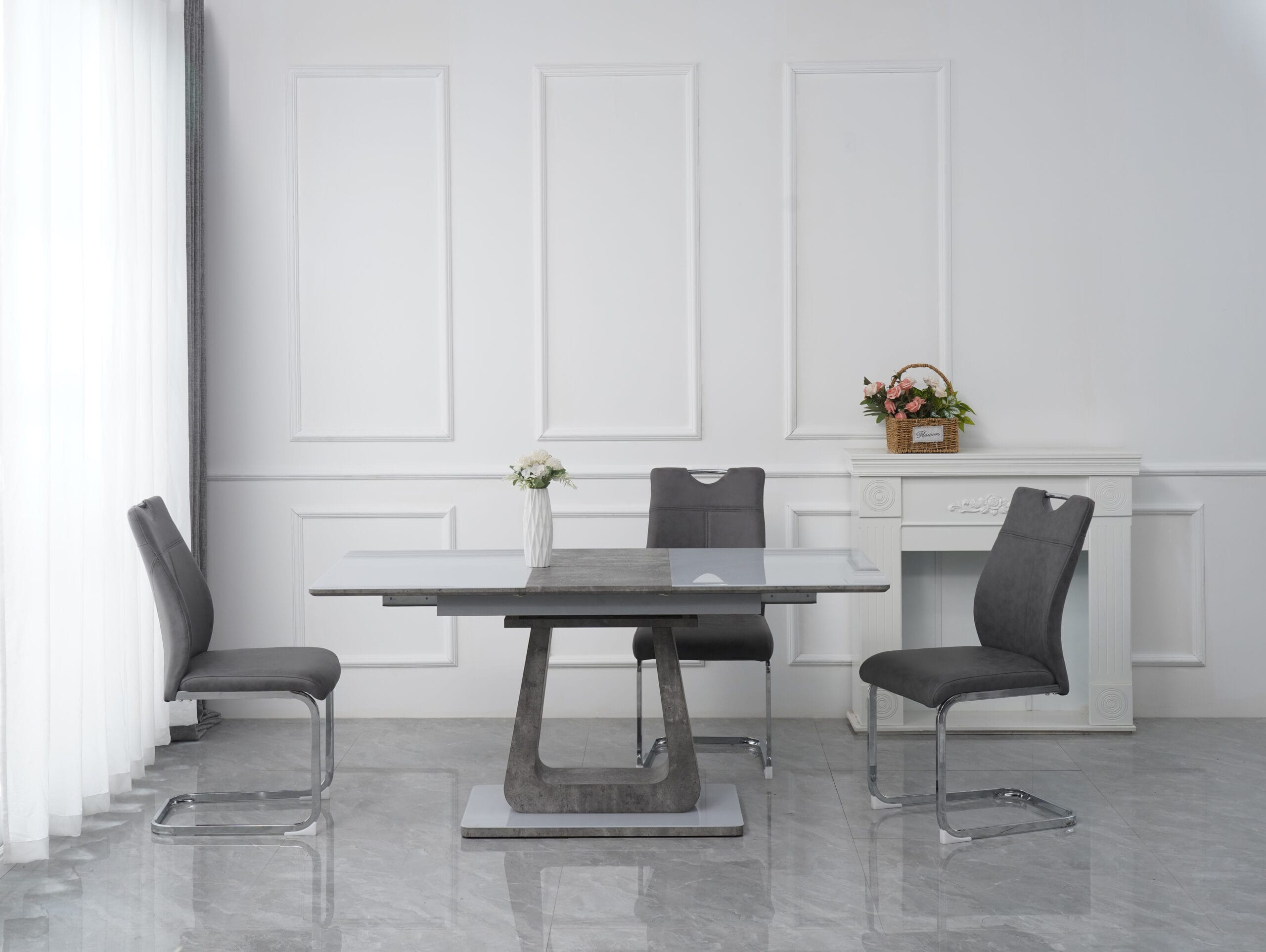 Stolica DC2406 kombinuje moderan dizajn i udobnost – siva presvlaka od kvalitetnog materijala daje elegantan izgled, dok kromirane metalne noge osiguravaju stabilnost i čvrstoću. Idealna je za trpezariju, ali se lako uklapa i u druge prostore.